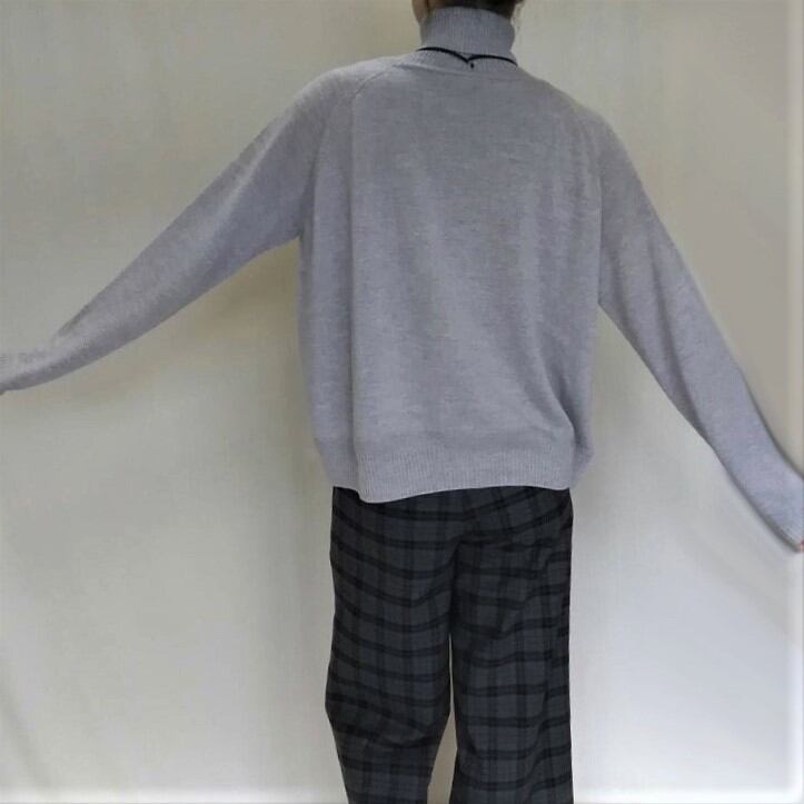 ゆったりと幅広でチャーミング感に満ちていて、ラグラン袖のラインと大きく入った両サイドのスリットとそれを囲む編地・そして袖先と裾周りのリブ編みの上に入ったお揃いの細かい編地にと、それぞれさり気無いようなのに、しっかりと拘りがあるんです!