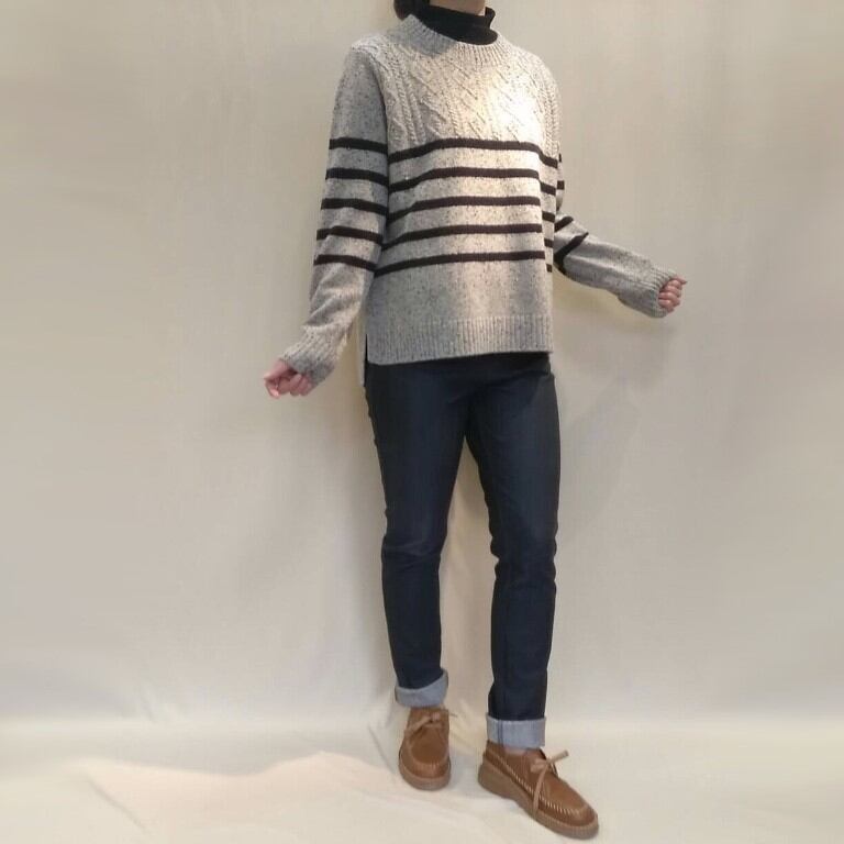 数色のゴマを散りばめたようなネップ糸を用い、腕と身頃の一部にくっきりと入ったボーダーがスタイリッシュでマニッシュな印象を与えてくれます。