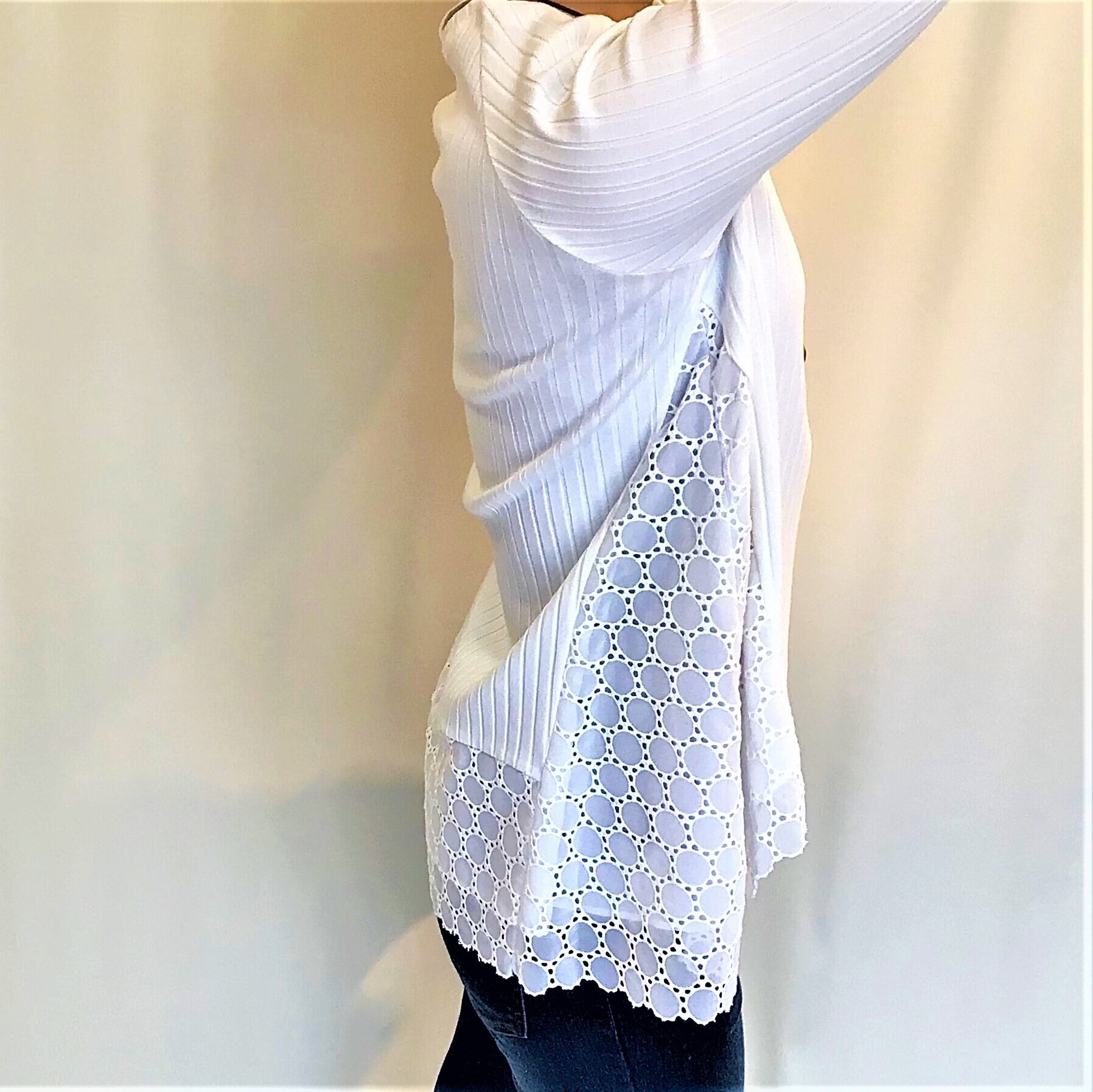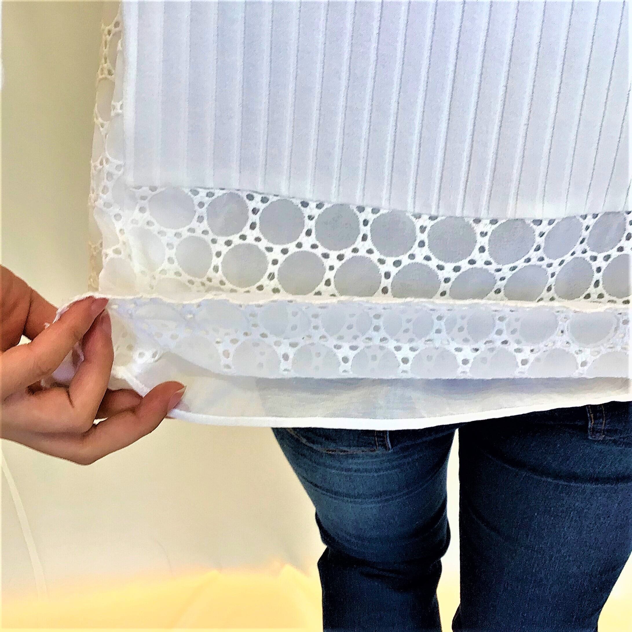 両サイドの幅広いマチ部分と後ろ見頃の裾周りにあしらわれたソフトなレースが、エレガントな仕上がりになっています。